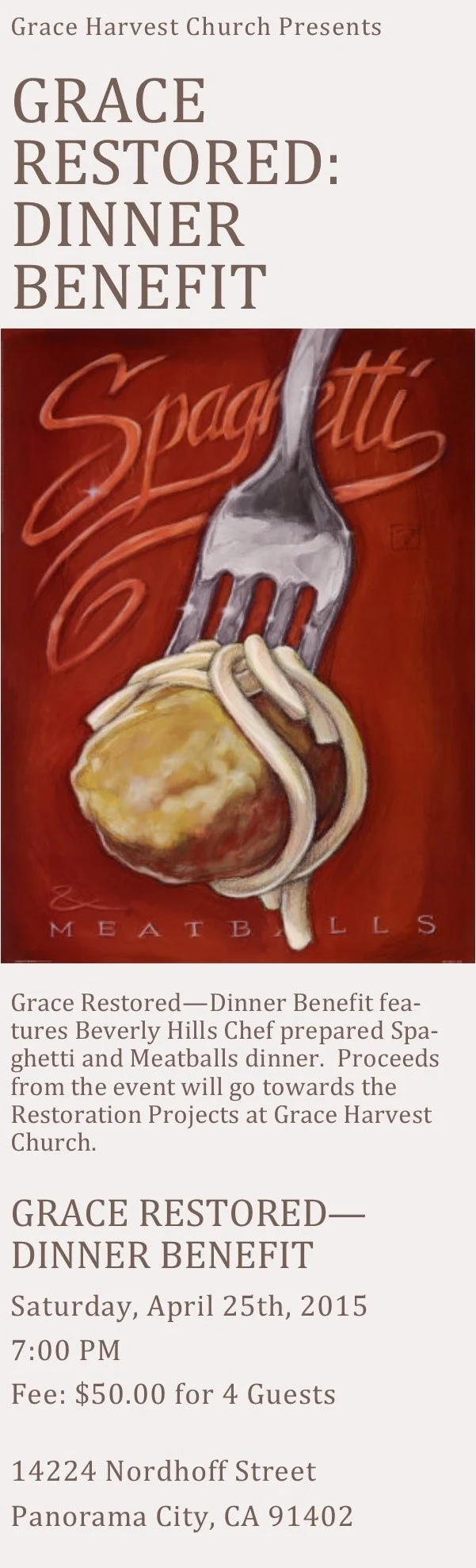 Grace Restored Dinner Benefit Saturday, April 25, 2015 7:00 PM 9:00 PM 19:00 21:00 Google Calendar ICS View fullsize